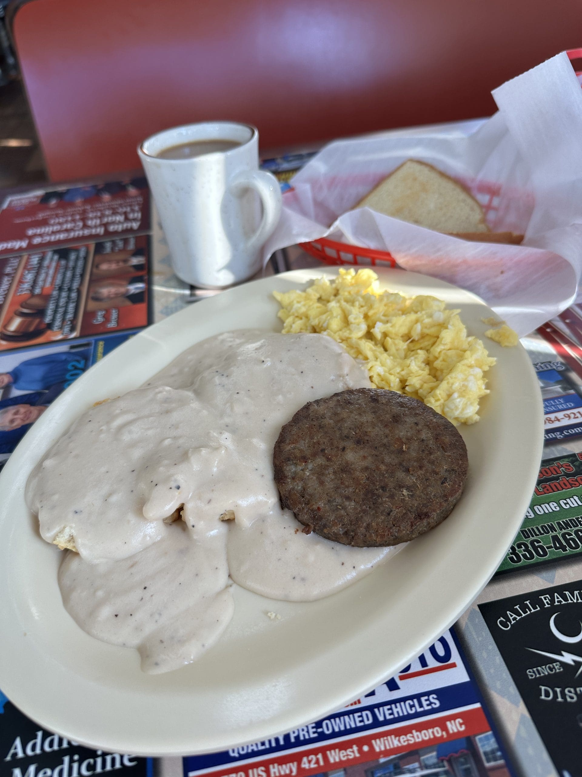 We stopped in at Glenn’s restaurant for breakfast, a longtime local spot near the Tyson processing plant that’s been serving Wilkes County for decades. Glenn’s is known as a gathering place for locals — the kind of restaurant where everyone seems to know each other, and the coffee never stops pouring.