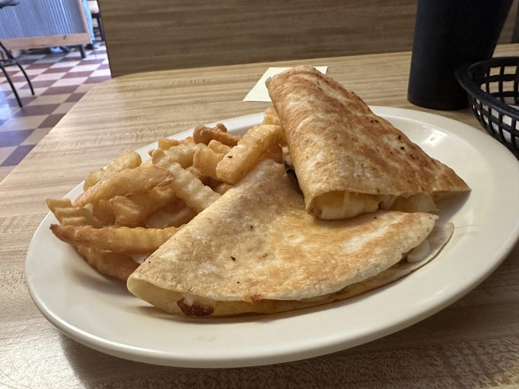 We stopped at Moravian Falls Grill for lunch on our way back from visiting Perry Lowe Orchards. I ordered the chicken quesadilla special with fries, while Jenn went for the popcorn chicken and fries.