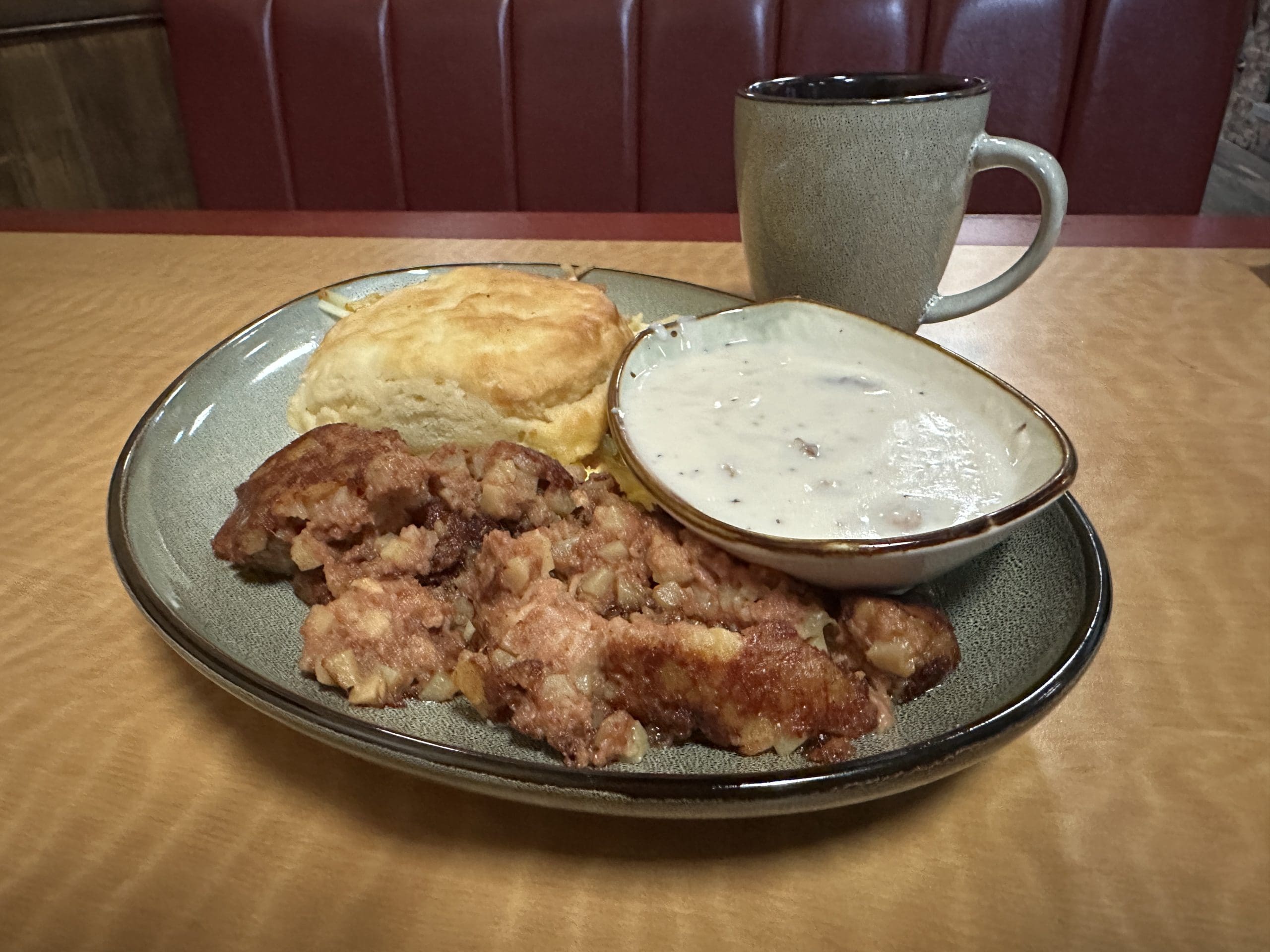 We started one morning with breakfast at Cagney’s Kitchen, a popular local favorite known for its hearty Southern comfort food. Jenn went healthy with eggs, turkey bacon, and fresh fruit, while I went all in with corned beef hash and eggs, biscuits and gravy, and crispy hashbrowns — all washed down with plenty of hot coffee.